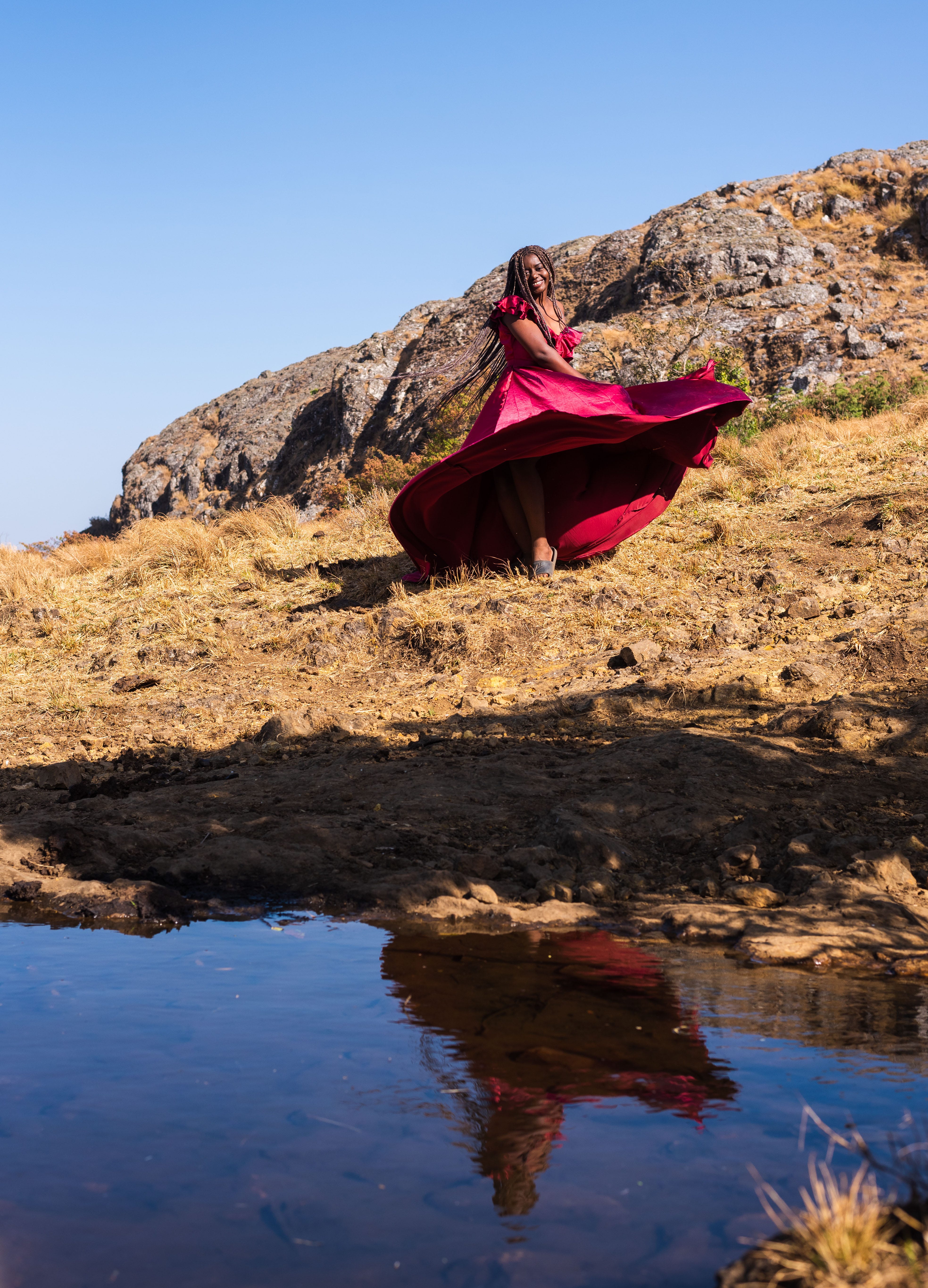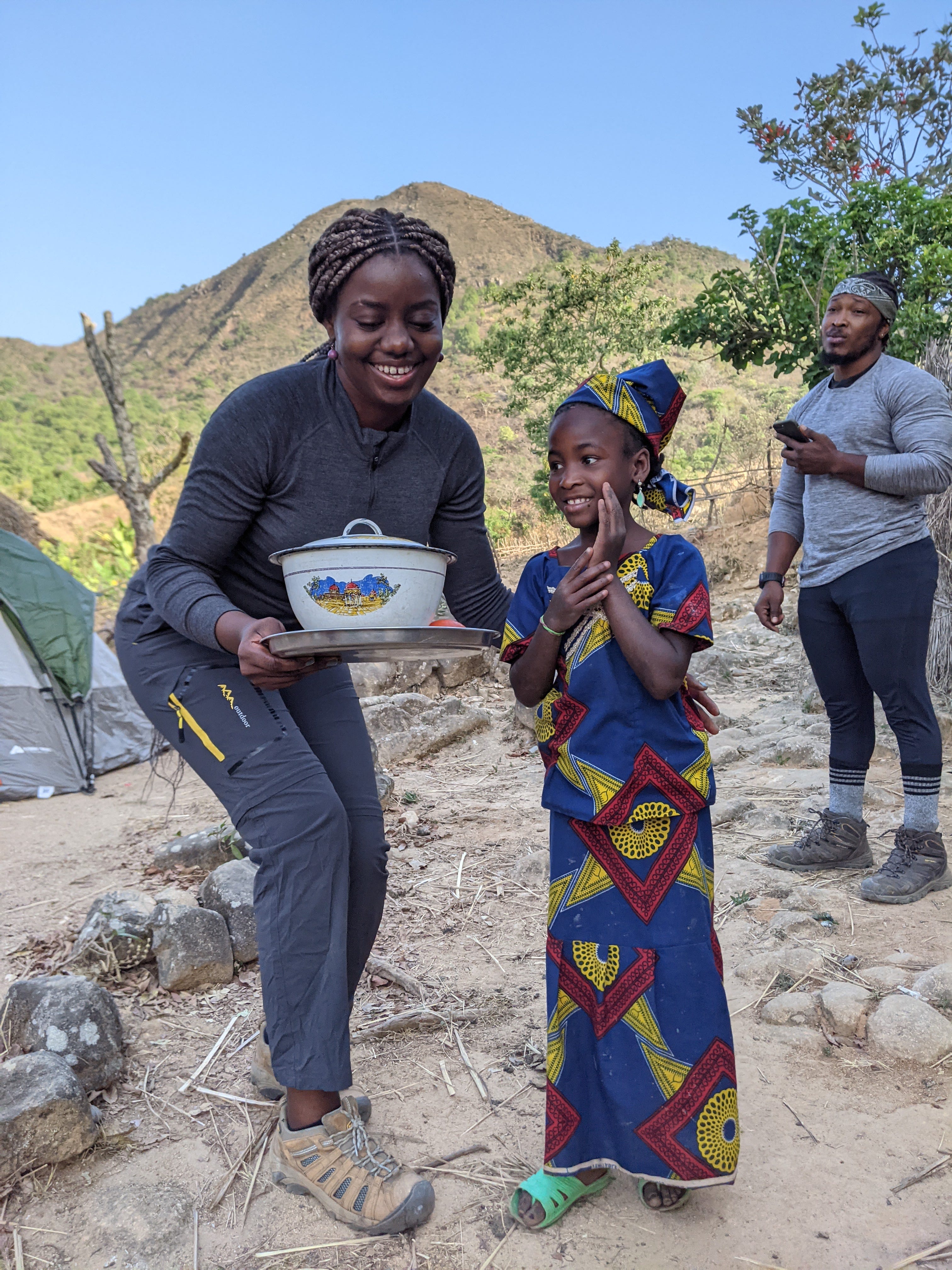There was no rush on this morning, just a lot of joy. I had lofty plans of catching the sunrise but man proposes and God disposes. I stayed in the tent chatting with Ibinabo and Rosie about any and everything. I even used my charming voice from inside the tent to sweet talk Kingsley into bringing me a hot cup of Milo. I was tired jo, and it was cold. Eventually, as the morning became warmer, I changed into some of the glamorous outfits I had brought for the mountain photoshoot. This was a lot of fun; with the camera capturing every twirl. These photos taken by Dotun are spectacular. The rangers made us a most delightful breakfast of rice, beans and stew and then we gathered up our things, burned our trash and cleared out camp.