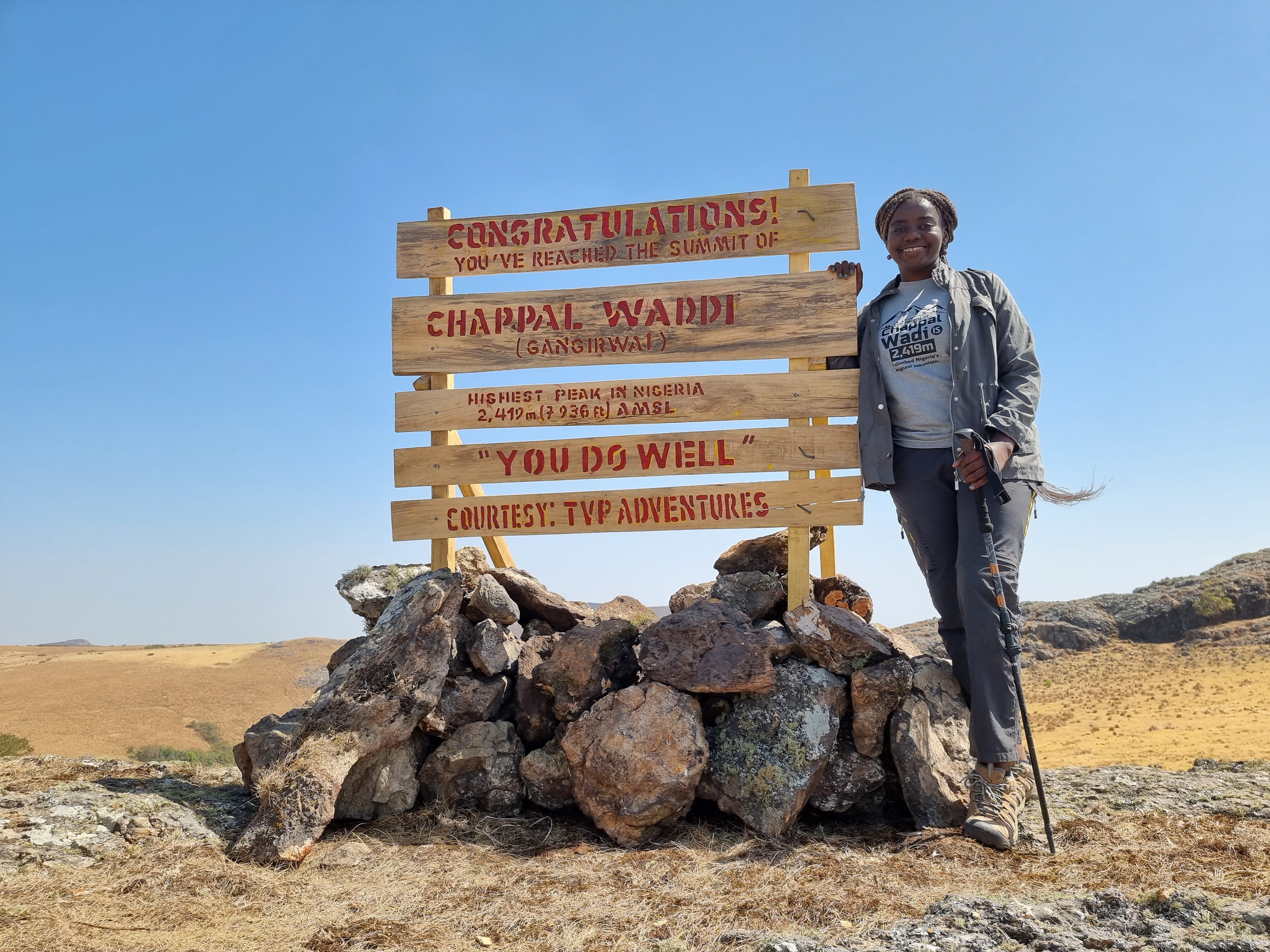 Currently, there is a signpost marking the summit of the highest mountain in Nigeria and West Africa, created and designed by Yours Truly, and donated by TVP Adventures. When you visit Chappal Waddi and you see this landmark, please tell the story that Funmi and her friends did that. Surreal!